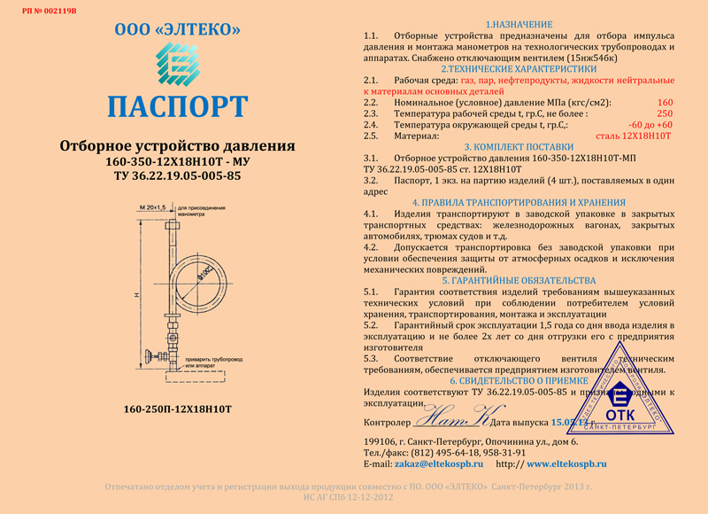 Паспорт качества на отборное устройство